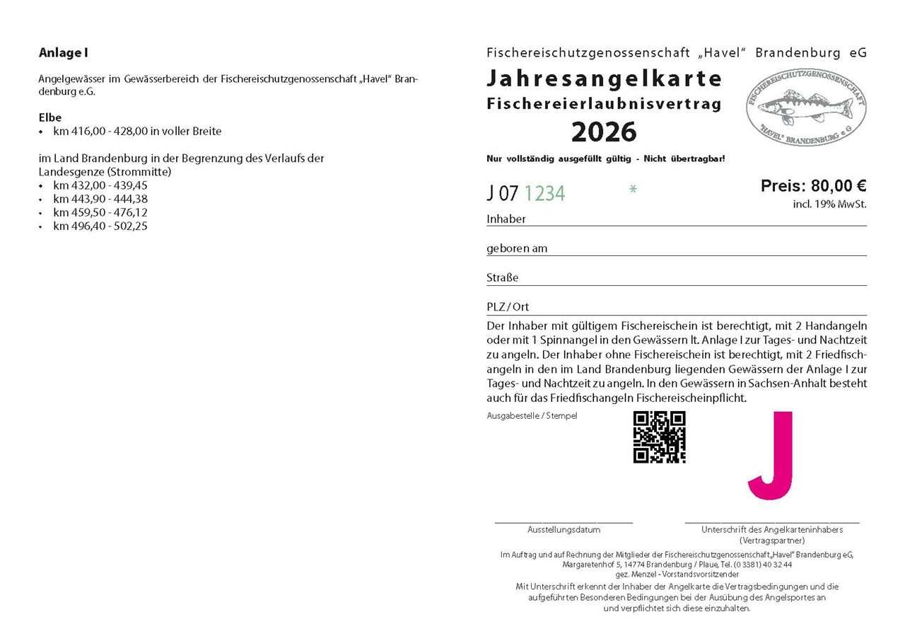 Verfügbarkeit J07 - Jahreskarte Elbabschnitte Fried- und Raubfisch inkl. Nacht JAK-FR-J07 Vorname Nachname Straße Hausnummer Postleitzahl Ort Geburtsdatum Tag12345678910111213141516171819202122232425262728293031MonatJanuarFebruarMärzAprilMaiJuniJuliAugustSeptemberOktoberNovemberDezemberJahr1927192819291930193119321933193419351936193719381939194019411942194319441945194619471948194919501951195219531954195519561957195819591960196119621963196419651966196719681969197019711972197319741975197619771978197919801981198219831984198519861987198819891990199119921993199419951996199719981999200020012002200320042005200620072008200920102011201220132014201520162017201820192020202120222023202420252026 80,00 € * inkl. MwSt. zzgl. Versandkosten Menge: In den Warenkorb Weitersagen Fragen zum Artikel? Details Fischereierlaubnisschein Fischereierlaubnisvertrag (Angelkarte) J 07 Berechtigung für folgende Gewässer und Strecken: Elbe km 416,00 - 428,00 in voller Breite Elbe km 432,00 - 439,45 / km 443,90 - 444,38 / km 459,5 - 476,12 und km 496,40 - 502,25 in der Begrenzung des Verlaufs der Landesgrenze (Strommitte)